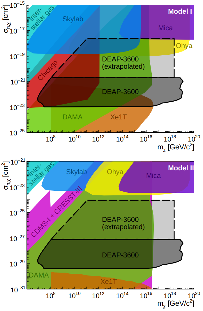 DEAP-3600 performed the first search for ultra-heavy dark matter with masses up to the Planck scale--the rough theoretical upper bound on the mass of simple particle dark matter, according to many of the most straightforward models. Our dedicated search for this unique signal observed no events consistent with our search, but allowed us to place the first direct detection constraints at such high masses using this technique, and has paved the way for future experiments to attempt similar analyses. Shown on the left are two different superheavy dark matter models we considered in this analysis -- see the paper cited below for more details.
