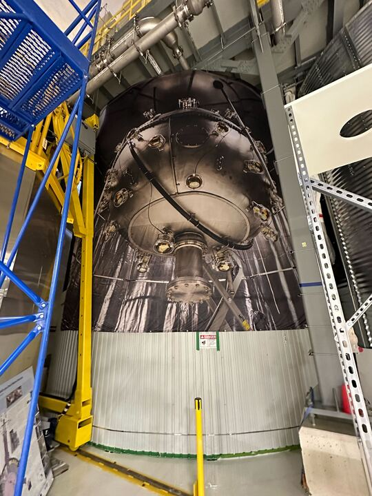 (Right): Zoomed-in photo of the poster depicting the detector on the water tank