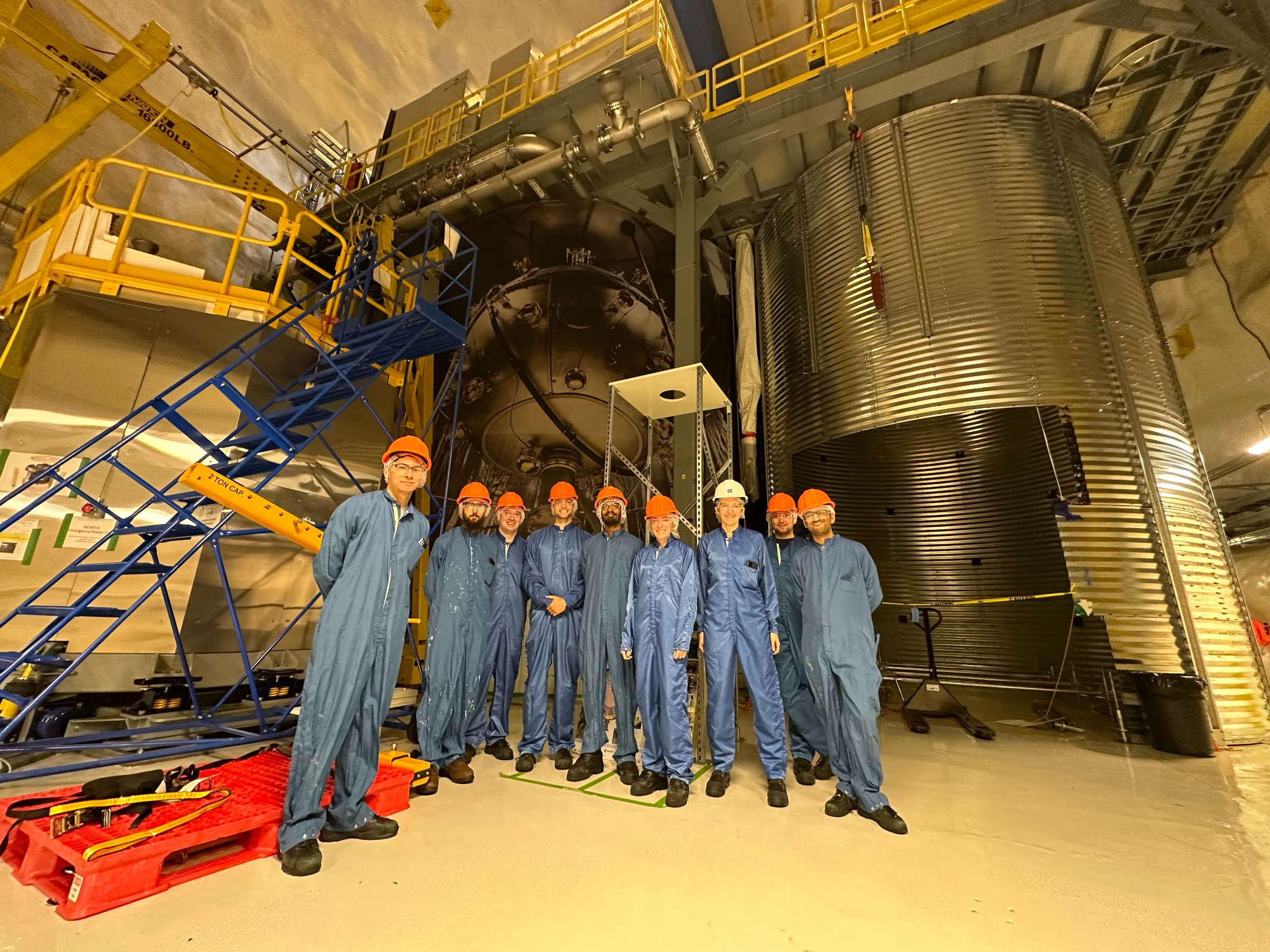 (Left): DEAP-3600 team members standing in front of the water tank containing the detector in SNOLAB