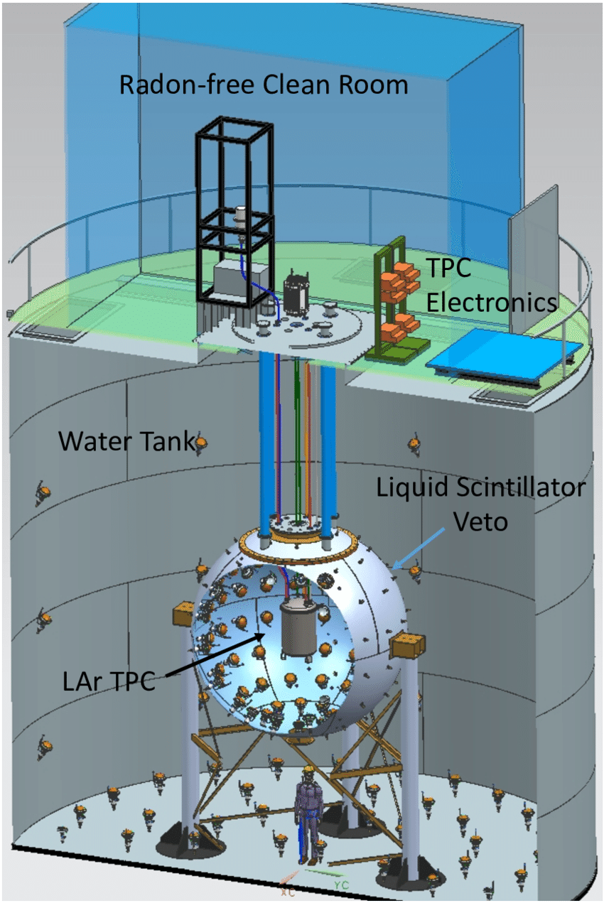 Liquid Scintillator Veto: One of the most important backgrounds in a WIMP search comes from neutrons, which can scatter on a single argon nucleus in the TPC, producing a signal exactly like a WIMP. Radiogenic neutrons are produced by rare nuclear reactions in the detector material, including spontaneous fission of 238U or (α,n) reactions induced by trace α-emitting radioactive contaminants. The liquid scintillator veto (LSV) is a neutron veto: if it detects a neutron in coincidence with a WIMP-like signal in the TPC, it allows us to identify the event as a background. The LSV uses a boron-loaded organic liquid scintillator -- a mixture of pseudocumene and trimethyl borate -- which is a highly effective neutron moderator that can quickly thermalize neutrons that enter the LSV. Once the neutrons slow down, they capture on 10B in the trimethyl borate, which produces recoiling α and  7Li nuclei as a delayed coincidence signal. The prompt thermalization and delayed capture scintillation signals provide two powerful handles for tagging neutrons with >99% efficiency.