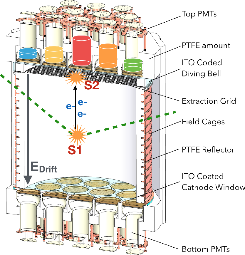 LArTPC: The liquid argon time projection chamber is the innermost detector and the dark matter target. A particle that scatters in the detector recoils off of either an atomic electron (electronic recoil) or an argon nucleus (nuclear recoil). The recoiling electron or nucleus excites and ionizes its neighboring atoms. The excited atoms de-excite by releasing photons (scintillation, or S1) which are detected by an array of photosensors (photomultiplier tubes, or PMTs) at the top and bottom of the TPC. The size of the scintillation pulse tells us the energy of the recoil, and its time profile powerfully separates electronic and nuclear recoils. Ionization electrons produced in the recoil and drifted in an electric field to a gas pocket at the top of detector, where a second, stronger electric field accelerates electrons through the gas pocket to produce a secondary pulse of light (S2), which is proportional to the number of extracted electrons. The time between S1 and S2 tells us the height of the interaction in the detector, and distribution of light on the top PMT array tells us the horizontal coordinates. If a particle scatters multiple times in the detector (which WIMPs will never do), we see multiple S2 pulses. These principles are illustrated in the lower drawing.