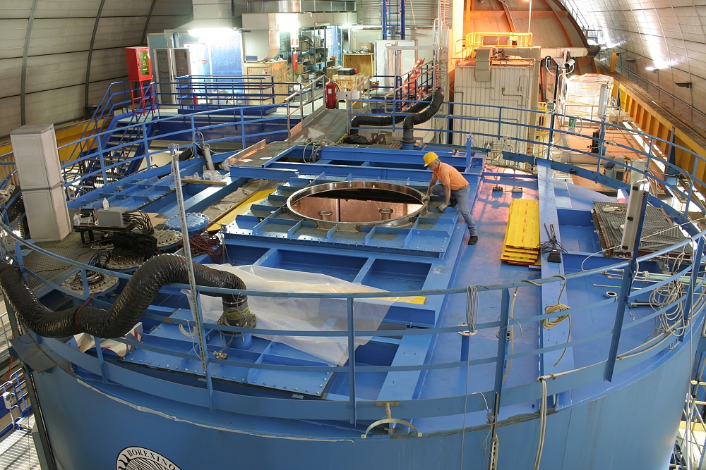 Middle: The top of the DarkSide-50 water tank from Hall C of LNGS, before installing the clean room on top of it