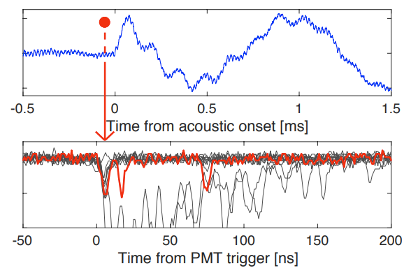 Bottom: PMT waveforms showing xenon scintillation. The bubble-coincident pulse shown in red; electron recoils in the same bubble time window generate scintillation pulses without bubble nucleation (gray)