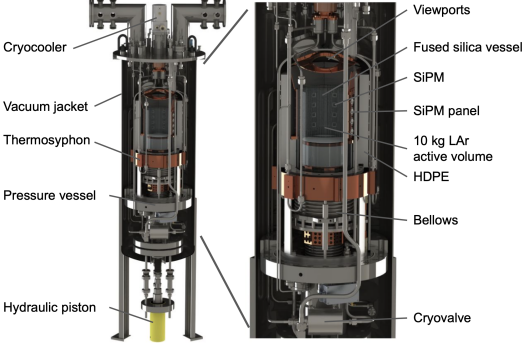 SBC-LAr10 Design:  The SBC-LAR10 consists of an active LAr volume of 10kg, along with 10-100 ppm of xenon shifting the scintillation wavelength to 175nm. the 175 nm light can passed through the silica vessel where it will be detected by an array of 32 inward facing SiPMs mounted on copper panels to minimizes the vertical thermal gradient across the active volume. Hamamatsu VuV4 SIPMs will be used for the SBC-LAr10 while SBC-SNOWLAB, a parallel detector with a focus on radiopure construction, will use SiPMs with lower uranium and thorium content. The inner components are housed in a stainless steel pressure vessel with LCF4 to act as hydraulic fluid. Resistive temperature detectors are placed throughout the pressure vessel for thermodynamic regulation, and to monitor the temperature. The pressure in the LAR volume is controlled by an external hydraulic piston that connects through a bellow to the pressure vessel, which is housed in a vacuum jet and cold with liquid nitrogen. SBC-LAR10 will operate 100m underground at Fermilab to reduce cosmic-ray muon rate by an amount sufficient to allow low-energy calibration without additional shielding. External shielding will be required to minimize the environmental neutron rate.