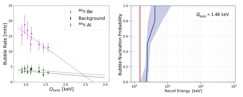 Right: The probability of bubble nucleation as a function of nuclear recoil energy at a fixed Seitz threshold of 1.48 keV. The efficiency curve is constrained by the observed bubble rates when exposed to 207BiBe, 88YBe, and 252Cf sources. The solid blue line and shaded region indicate the best fit efficiency curve with the red line indicating the calculated Seitz threshold.