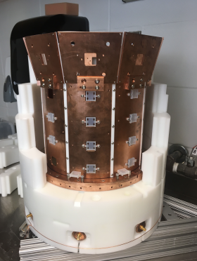 Right: Partially assembled HDPE castle isolating the warm target region from the cold, stable region, enclosing the copper SIPM support structure that surrounds the target volume. 3 of 8 piezoelectric acoustic sensors are visible at the bottom of the castle.