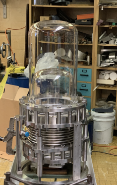 Middle: Test of the SBC-LAr10 inner assembly consisting of the inner and outer fused silica vessels, bellows guides and support structure, stainless steel bellows, and spring-energiezed PTFE silicia-to-metal seals.