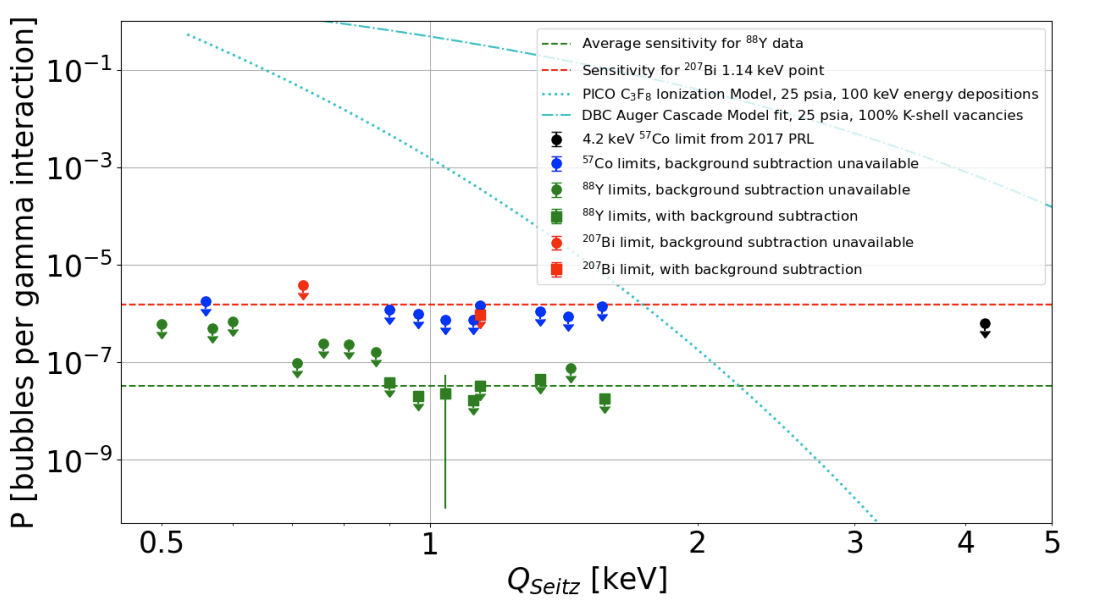 Left: Electron recoil sensitivity of the prototype xenon bubble chamber as a function of superheat (Seitz threshold). There is no evidence seen for bubble nucleation by gamma sources. Dashed lines show the sensitives of measurements based on source strengths, background rates, and exposures. Square points are 90% confidence intervals with background subtraction and round points are the same but without background subtraction. The blue curves show the gamma sensitivity expected for a molecular fluid with the same thermodynamic physical properties as xenon, following the electron recoil bubble nucleation models for delta rays and auger cascades following xenon K-shell capture.